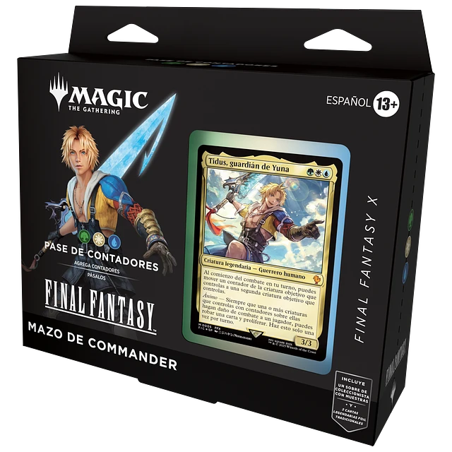 ¡Lidera la batalla con Tidus, Yuna’s Guardian en el Mazo de Commander – Counter Blitz, una fusión épica entre Magic: The Gathering y Final Fantasy X! Este mazo tricolor (verde, blanco y azul) ofrece una experiencia de juego única, centrada en la manipulación de contadores y estrategias sinérgicas.
